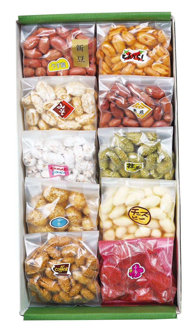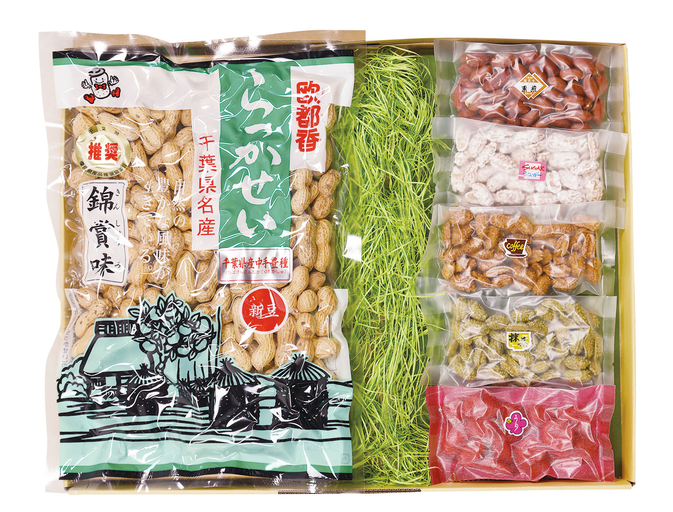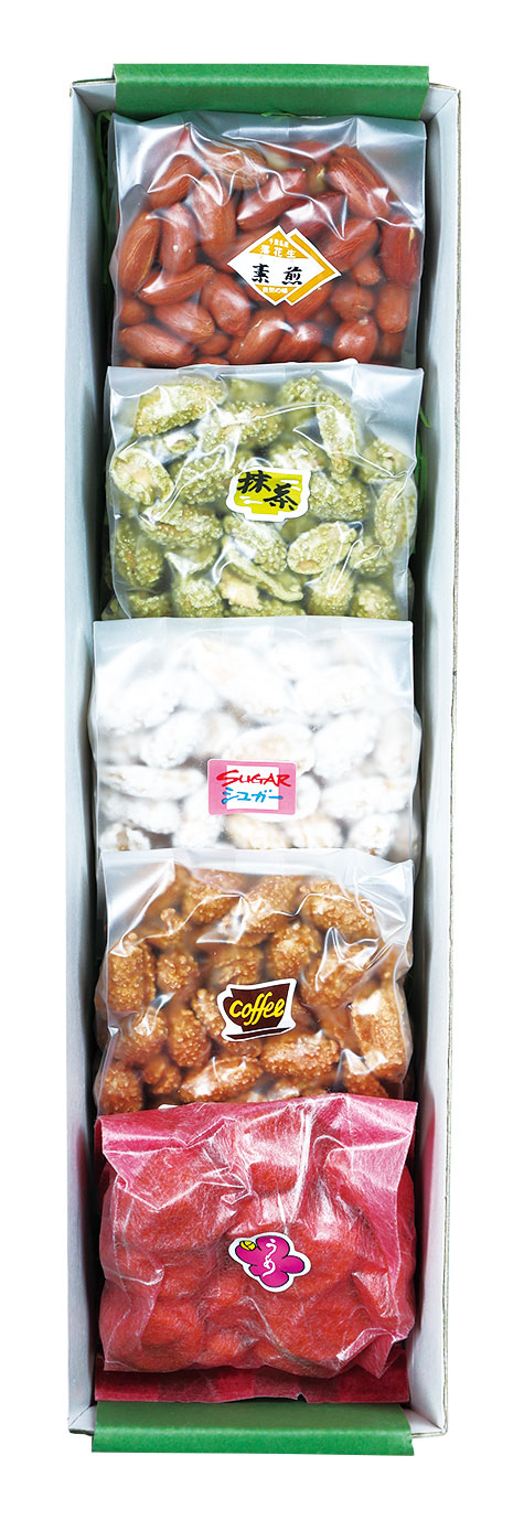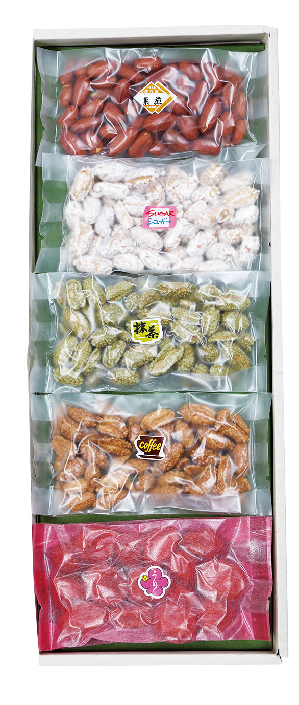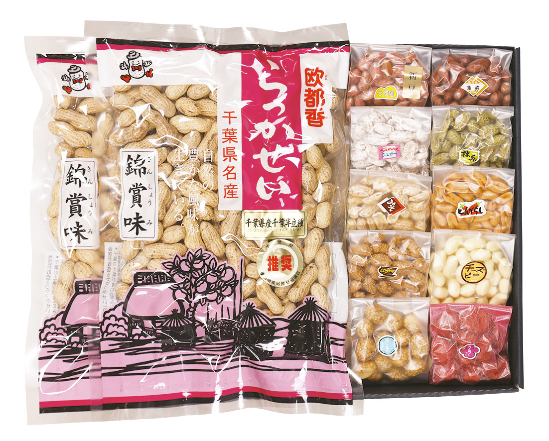千葉県産のからつき落花生といろいろな味が楽しめる豆菓子に大人気商品のピーナッツバターをセットしました。