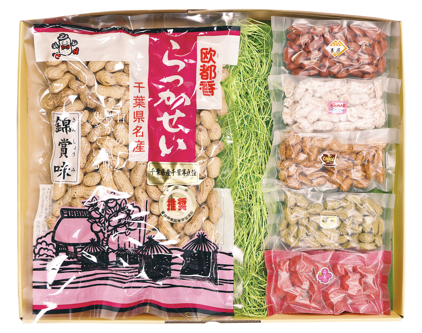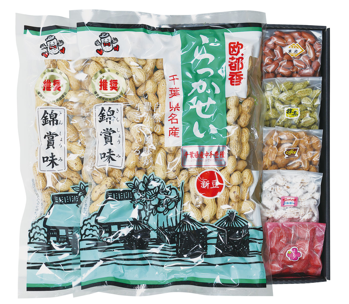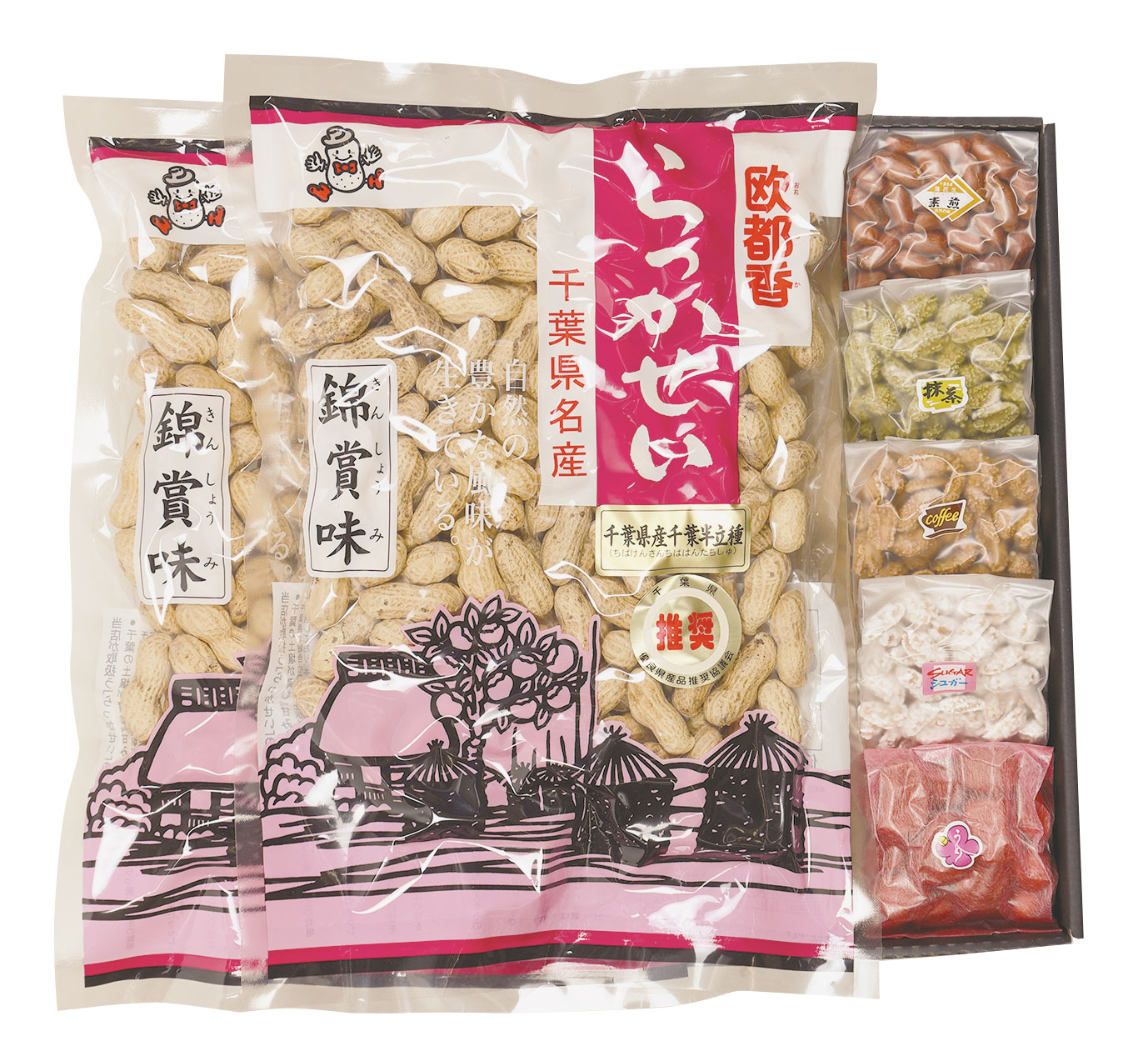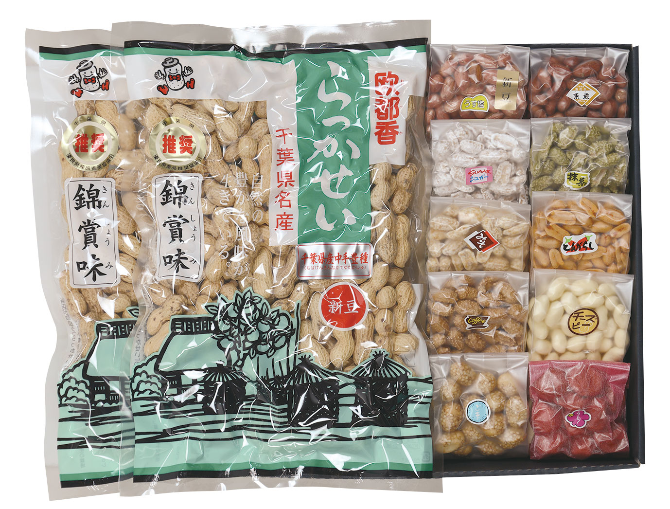 千葉県産のからつき落花生といろいろな味が楽しめる豆菓子に大人気商品のピーナッツバターをセットしました。